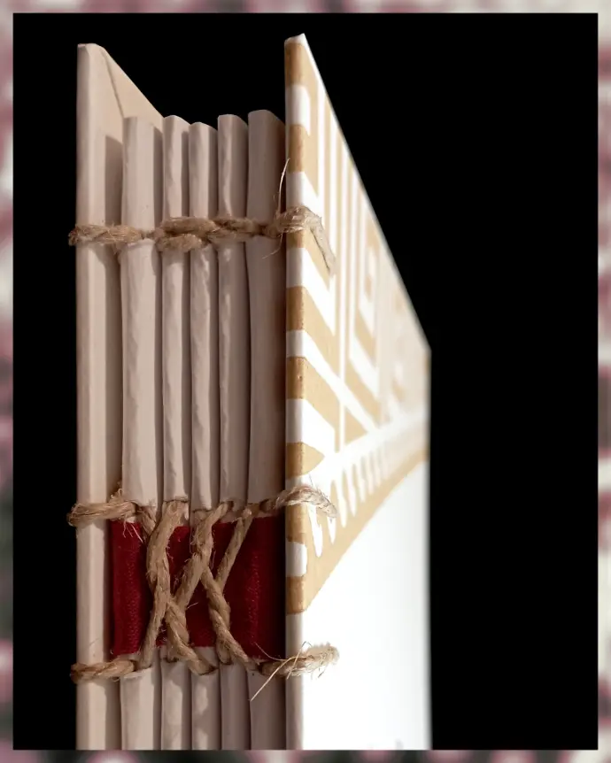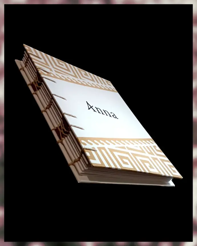 Un beau carnet à dessin ornementé de motifs gréco-romains imprimés en linogravure sur un papier mi-teinte et une touche de rouge avec des rubans dans la reliure, tout a été fait pour que l’ouvrage corresponde à son futur propriétaire.